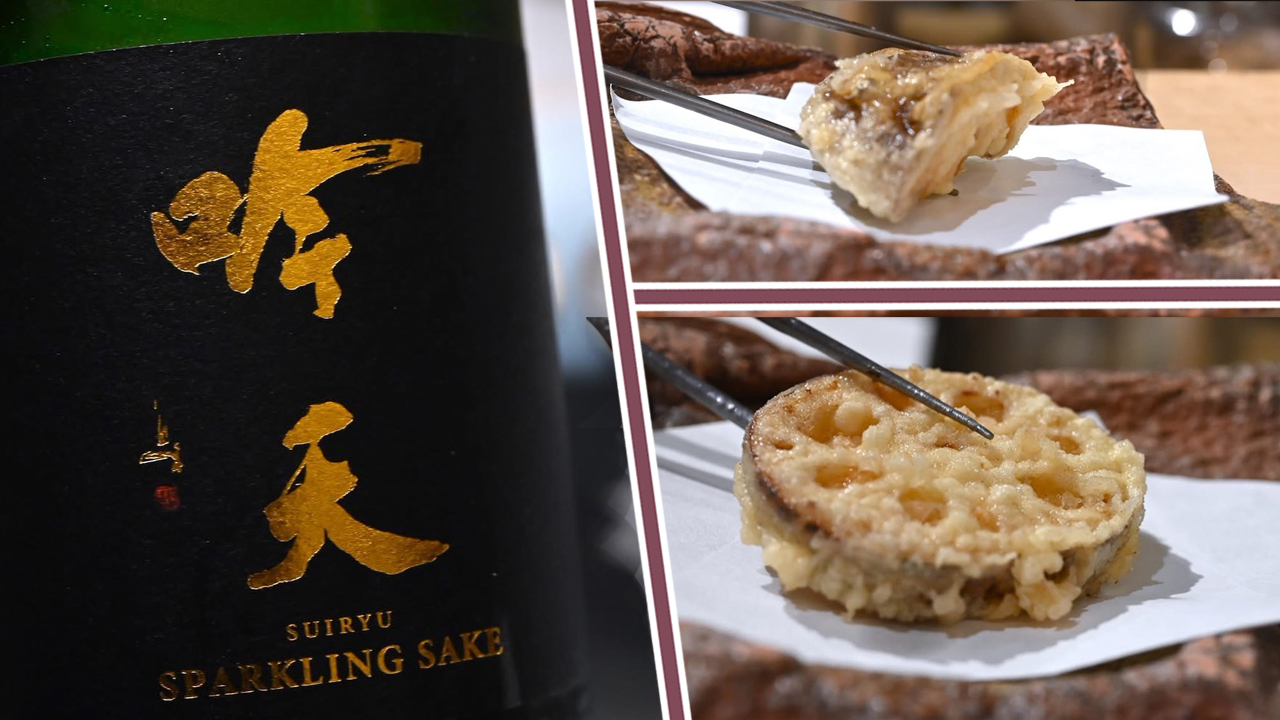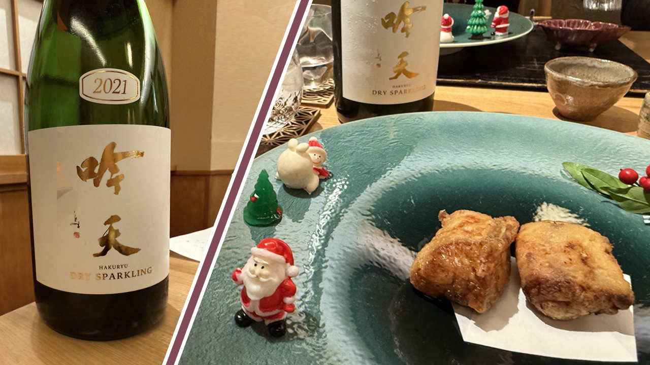 合わせた「吟天水龍 スパークリング」は、5年熟成の深い味わいです。米の甘味と、ふわっと香る吟醸の香り、そして、きめ細かな泡立ちの一品です。