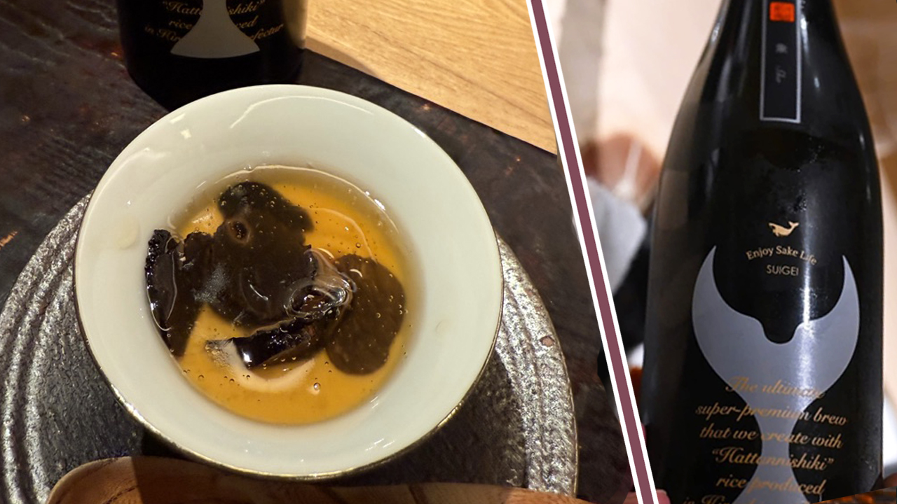 ここで、お店から特別に10周年のプレゼントとして「白子入りのトリュフの茶わん蒸し」が提供されました。黒トリュフのスライスがたっぷりのせられ、出汁の味が活きた茶碗蒸しで、白子が豊かな味わいを際立たせます。合わせるのは高知を代表する人気のお酒で「芳醇辛口」が特徴の酔鯨の純米大吟醸「象(sho)」。