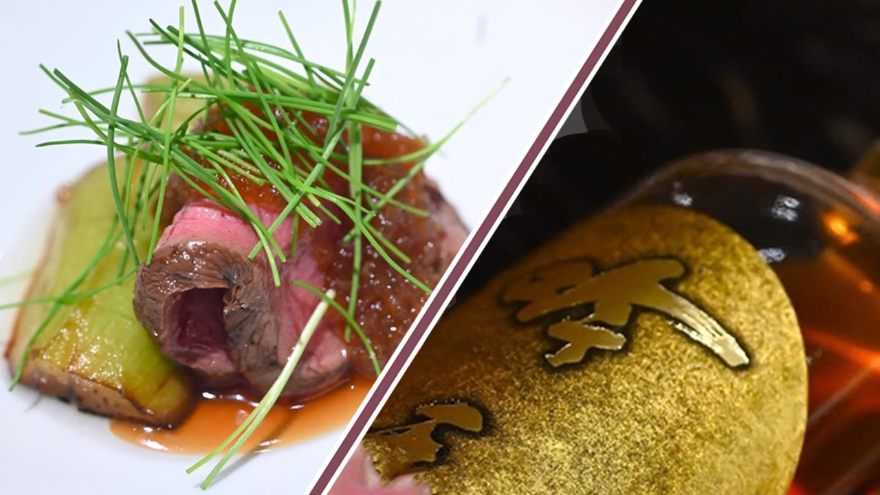 合わせる「吟天龍王」は、米と麹と水だけでつくっていますが、琥珀色でこっくりした甘みがあり、お肉にピッタリです。酒蔵「龍力」の4代目本田眞一郎会長が日本酒の地位向上のために20数年前から貯蓄してきた貴重な熟成酒をアッサンブラージュして1年寝かせたものです。甘みと酸味のバランスが絶妙で、なんて美味しいんでしょう。極上の味わいです。
